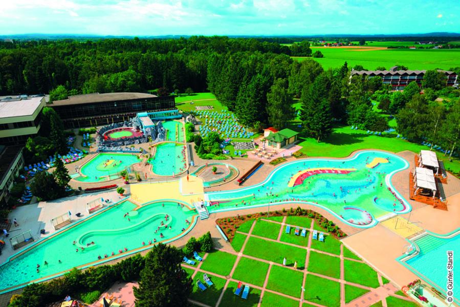 Bad Füssing liegt im Herzen des berühmten bayerischen Bäderdreiecks. Durch Zufall stieß man im Jahre 1938 in ca. 1.000 Meter Tiefe auf 56 Grad Celsius heißes, schwefelhaltiges Thermal-Mineralwasser. So wurde es innerhalb weniger Jahre eines der modernsten, bekanntesten und beliebtesten Kurbäder Europas. Bad Füssing ist kein gewöhnlicher Kurort, sondern eine architektonisch geplante „Insel“, die nur nach den Bedürfnissen und Wünschen des Kurgastes ausgerichtet ist. Die Heilwirkung der Bad Füssinger Thermalquellen ist legendär und macht den Kurort äußerst begehrt. Drei modern angelegte Thermen mit Kurmittelhäusern verfügen über eine Vielzahl von Thermalhallen und bieten die größte Thermalwasserfläche Europas. Ständig fließt das aus 1.000 Metern Tiefe geförderte Thermalwasser bei abgestuften Temperaturen von 28 bis 42 Grad. Die schwefelhaltige Therme bewirkt eine Umstimmung des Organismus und damit die Wiederherstellung körperlicher Abwehrkräfte. Wichtiger Bestandteil dabei ist der Sulfidschwefel mit seiner speziellen Wirkung auf das Knochen-Knorpel-System und seinem entzündungshemmenden Effekt. Bad Füssing bietet alles für einen kurzweiligen Aufenthalt: Kurpark, Tennis- und Golfplatz, Kunst- und Kulturprogramme, Einkaufs- und Restaurantbetriebe, Spielkasino sowie viele Abendprogramme im Ort.